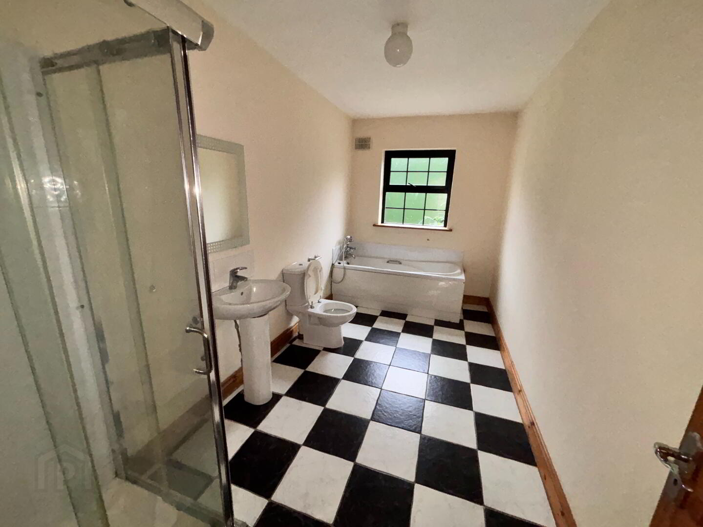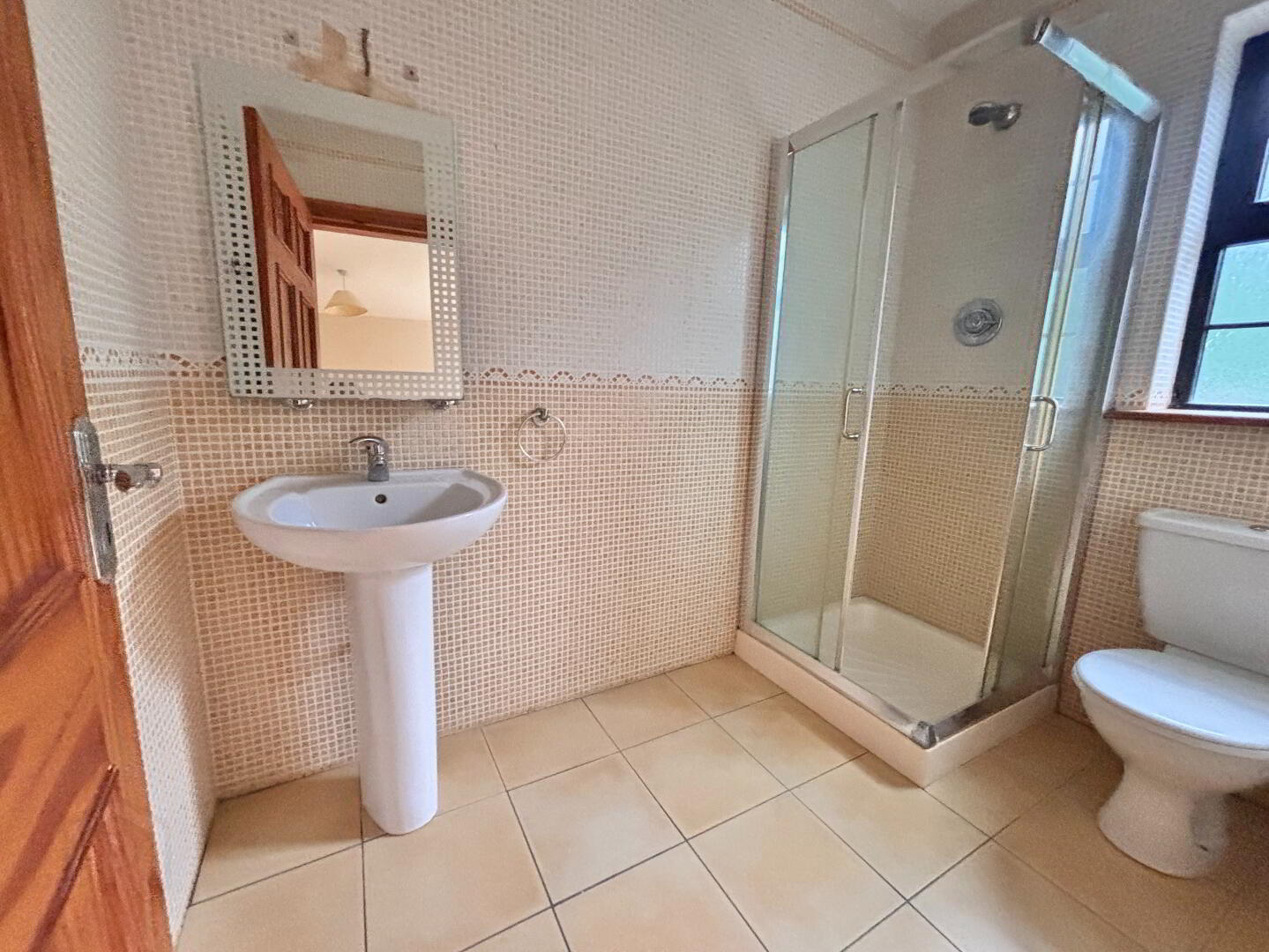 4.26m x 2.1m Bathroom being partially tiled with separate shower cubical and electric shower.