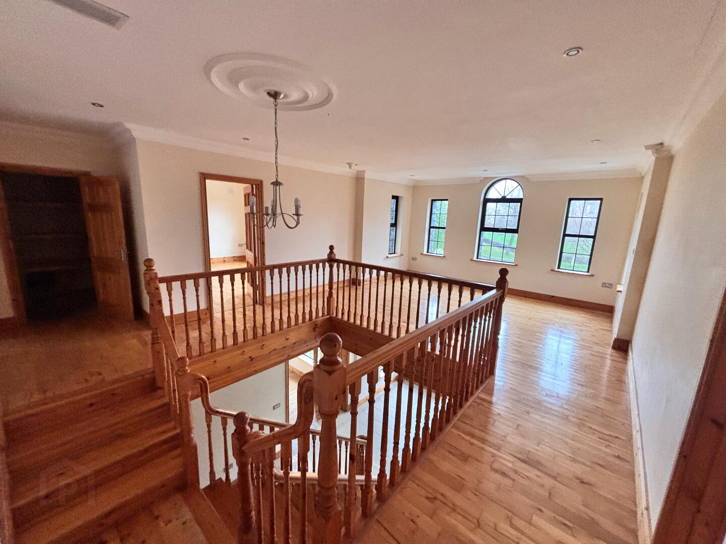 7.30m x 4.57m Landing area with split stairwell and semi solid wood floor.