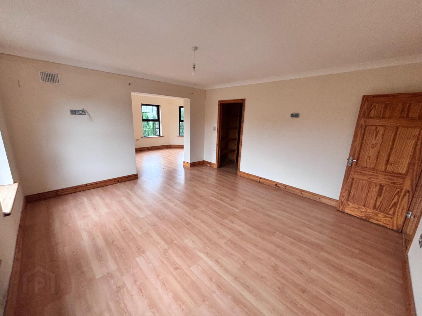 4.66m x 4.48m Bedroom 1 with double access from utility and hallway, semi solid wood floor