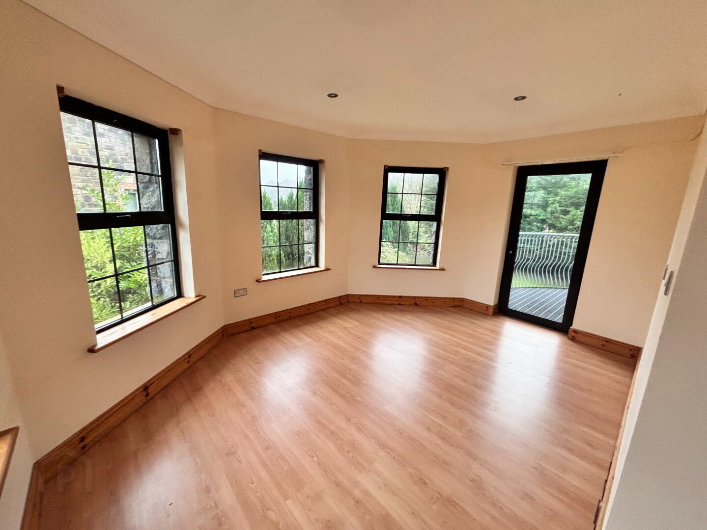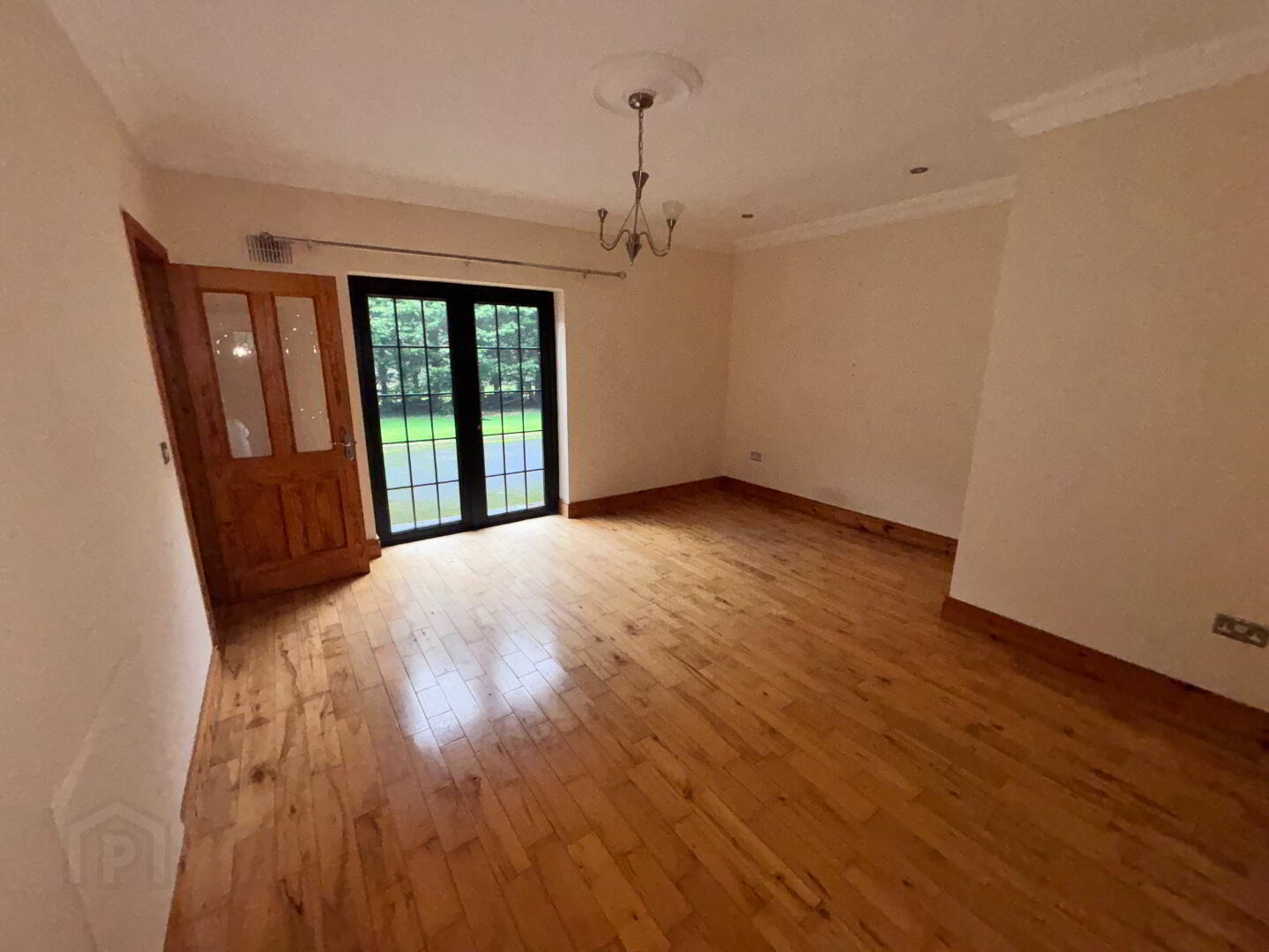 4.50m x 2.98m Bedroom 2 semi solid wood floor and patio door.