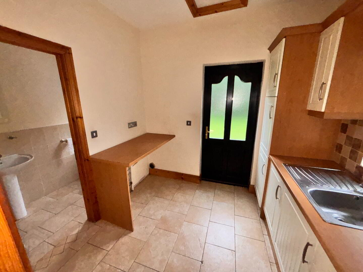 2.36m x 2.67m Utility room, fitted units, counter tops, sink and tiled floor.