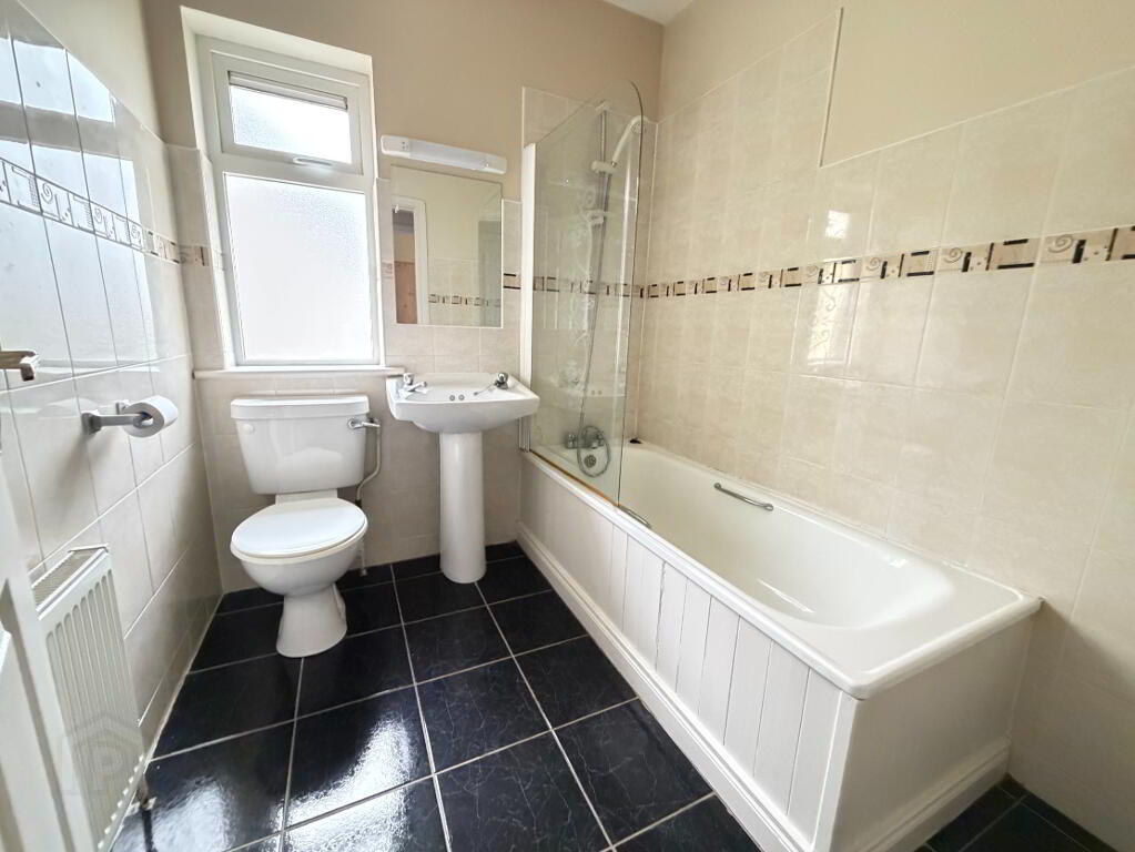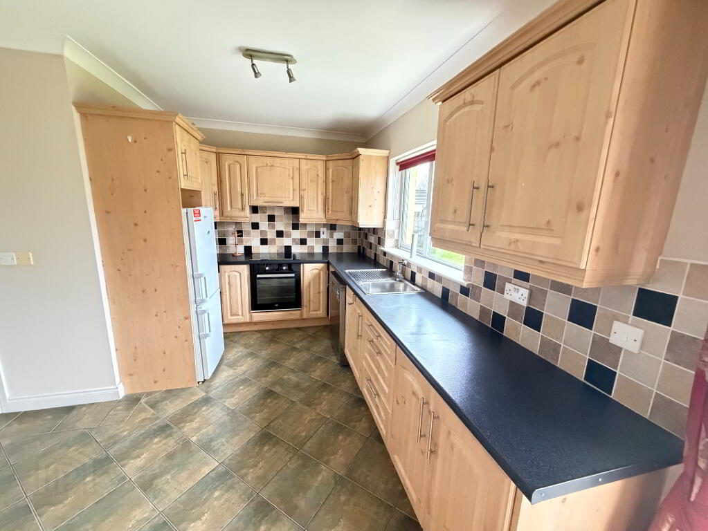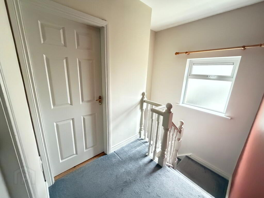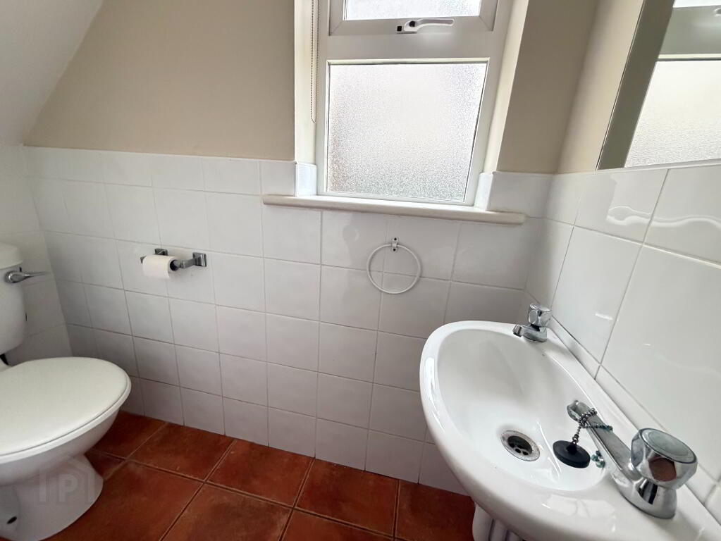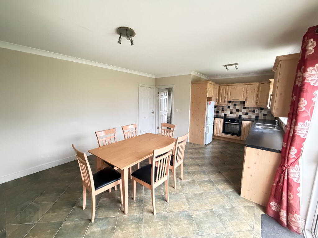 The property is well laid out and generously proportioned throughout. On entering, the tiled hallway leads to a convenient under-stairs guest WC being partially tiled. The bright sitting room features a laminated timber floor, coved ceiling and an open fireplace with gas insert, creating a comfortable and welcoming living space. To the rear, the kitchen/dining area boasts tiled flooring, fitted units, coved ceiling and patio doors opening out to the back garden, ideal for family living and entertaining. A separate utility room with tiled floor adds further practicality.